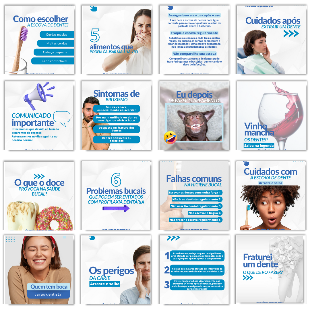 Criado com praticidade em mente, nosso pack de artes simplifica o processo de divulgação do seu trabalho nas redes sociais. Seja você um profissional experiente ou esteja iniciando sua jornada na odontologia, essas artes profissionais irão impulsionar sua presença online e atrair a atenção do seu público-alvo.