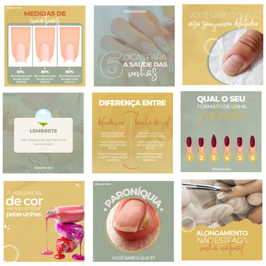 - +90 artes prontas, 100% editáveis pelo Canva Gratuito, para Nails Designers.