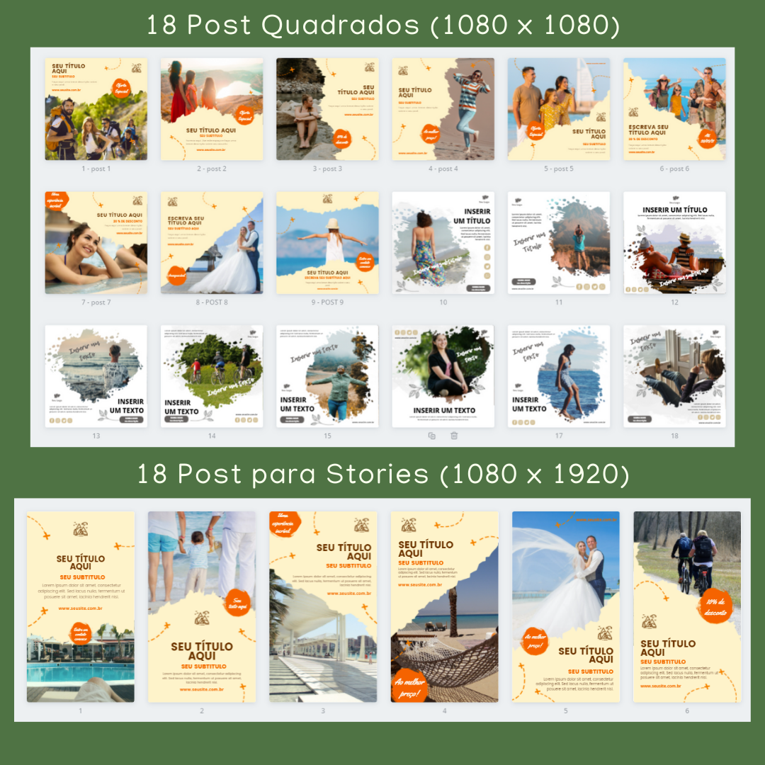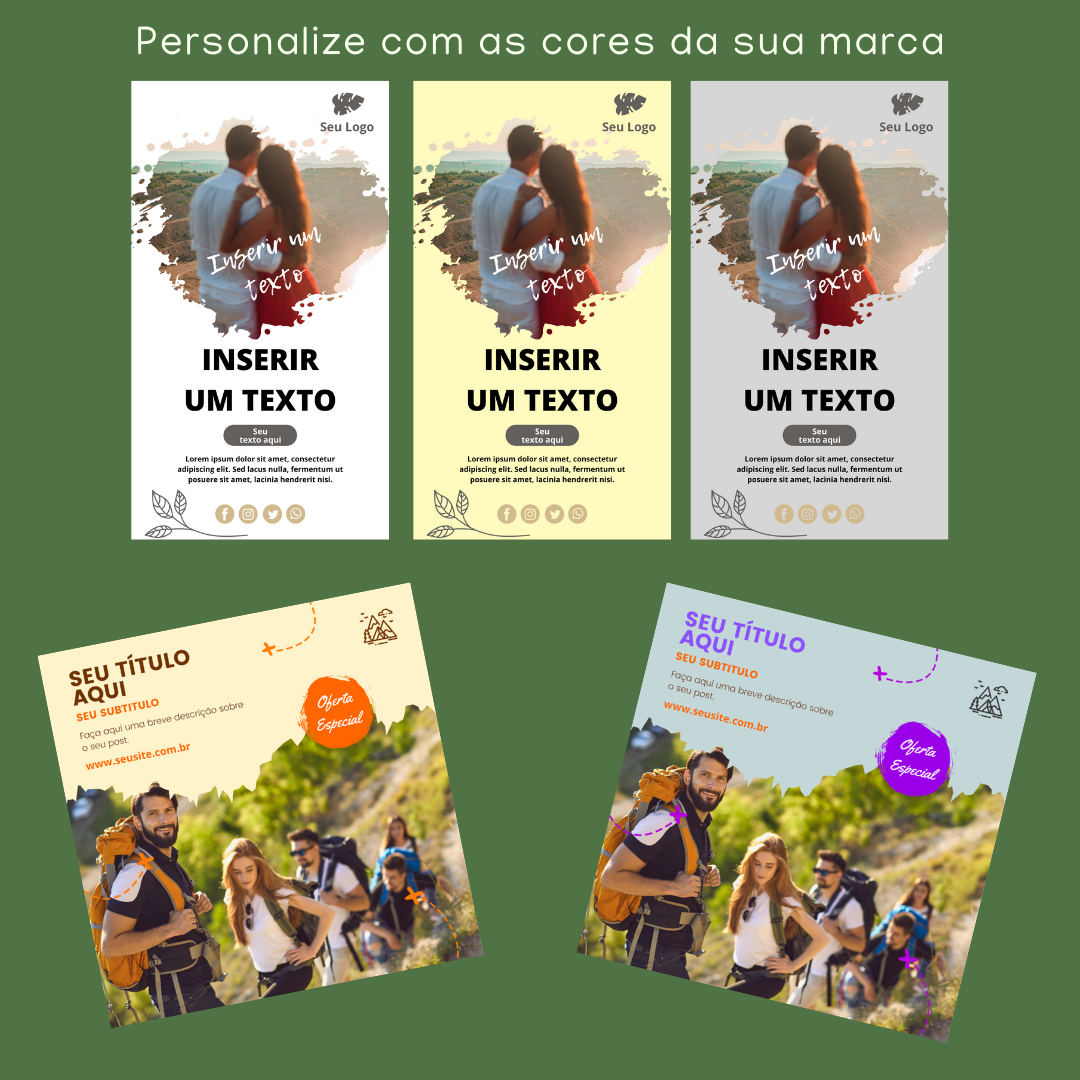 Edite facilmente as cores, fontes e imagens para personalizar cada postagem de acordo com seu estilo e destino. Deixe sua marca registrada no universo das viagens e conquiste seguidores apaixonados pela sua jornada. Aproveite este pack minimalista e transforme suas postagens em uma verdadeira inspiração para os amantes de viagens.
