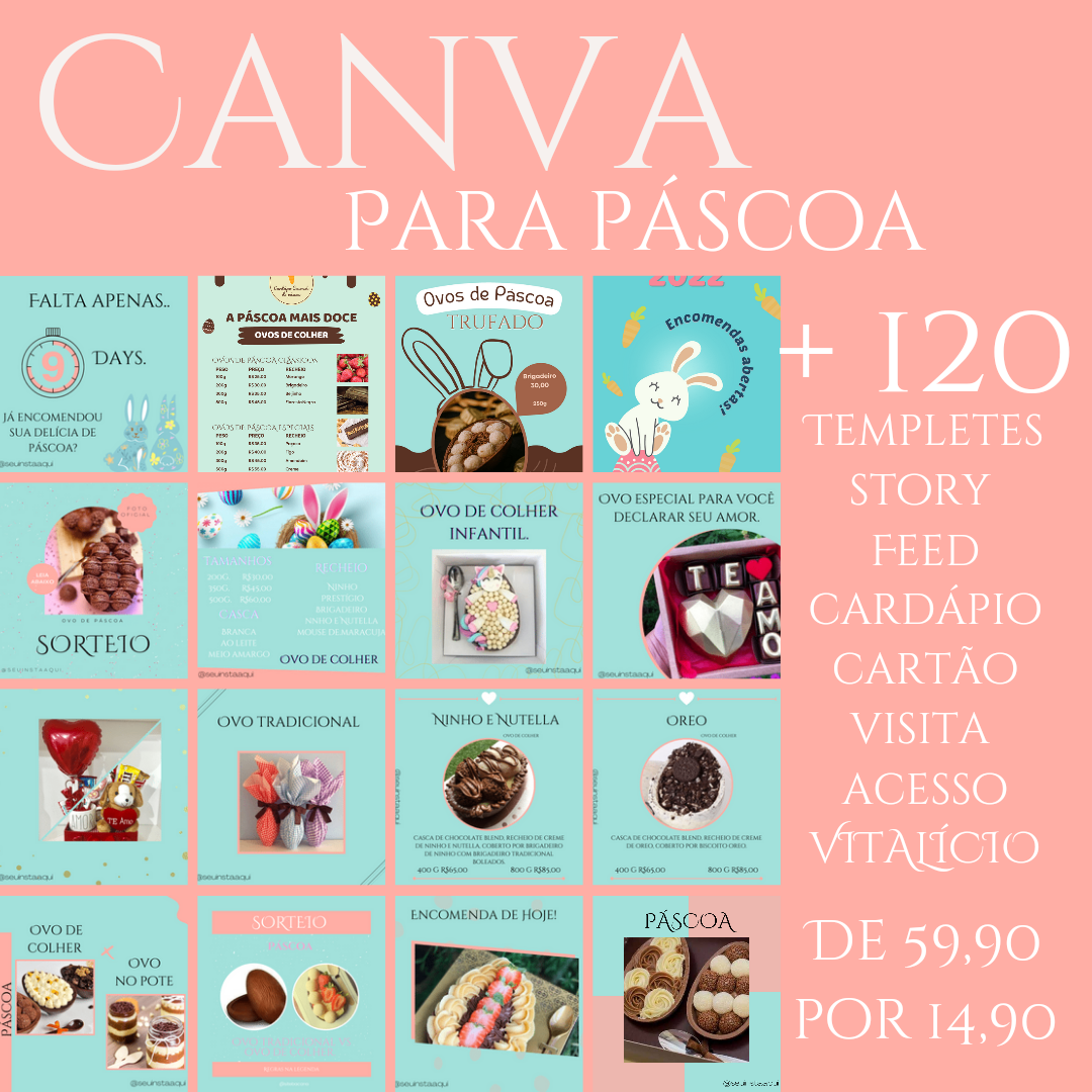 Não perca mais tempo tentando criar designs do zero. Com o Pack Canva para Páscoa, você terá tudo o que precisa para deixar a sua marca presente e impactar seus clientes nesta época especial. Aproveite essa oportunidade e garanta o seu pack agora mesmo!